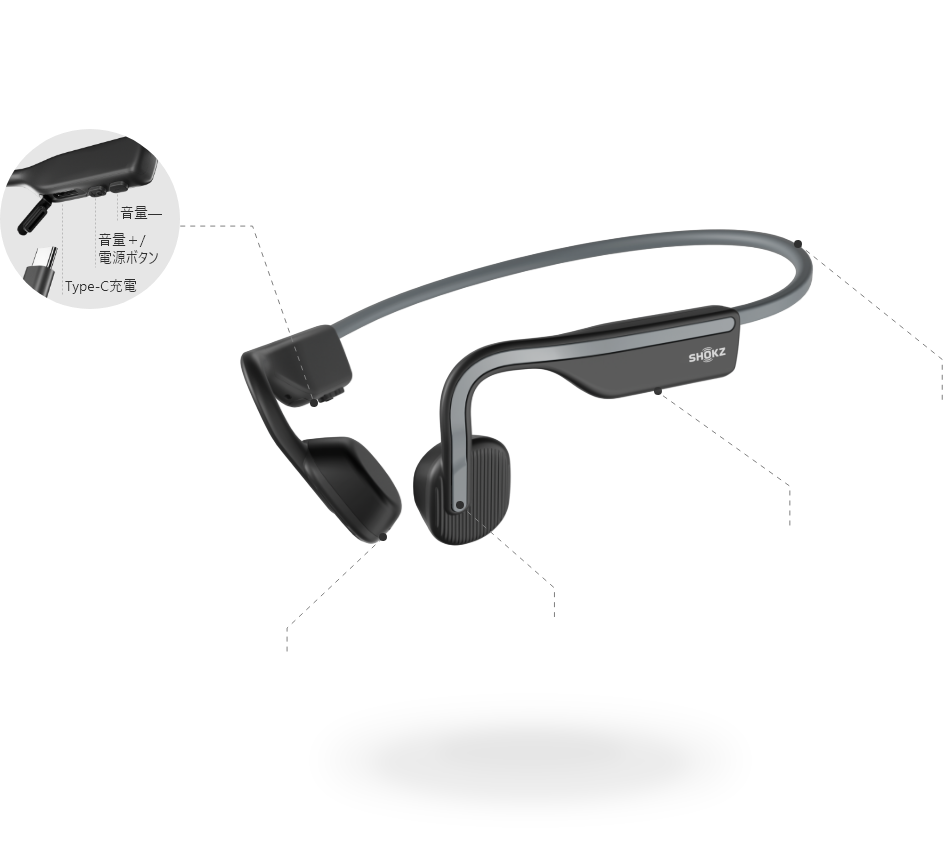 A:付属のUSB-C充電ケーブルでOpenMoveを充電することができます。USB-C充電ケーブルの端を、骨伝導イヤホンの充電ポートに差し込みます。保護フラップの下、「音量+」ボタンの隣にあります。充電器が5.25アンペアまたは5ボルトを超えないようにしてください。当社は急速充電器を推奨しておらず、骨伝導イヤホンは充電中に自動的に電源を切ります。