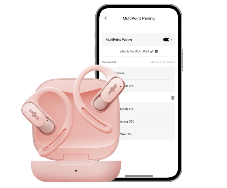 6. L'accoppiamento multipoint è disabilitato per impostazione predefinita e può essere attivato nell'app Shokz. Le cuffie possono memorizzare fino a 5 dispositivi.